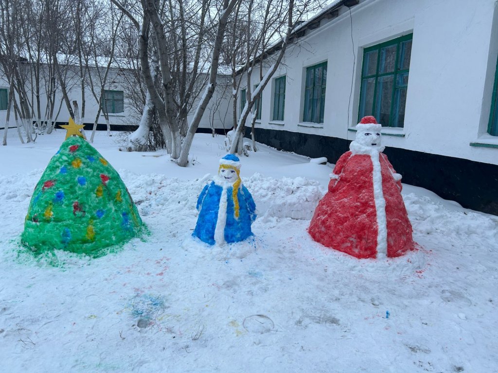 3. Қарлы қала. Қамту 6-9 сынып. Оқушылар мектеп ауласында жаңа жылдық тақырыпта қар фигураларын жасап, оларды бояды.