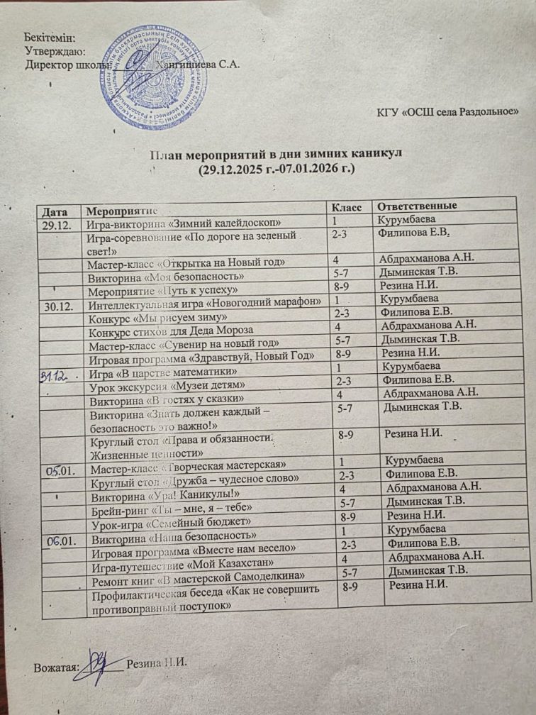 Қысқы демалыс кезеңіне арналған іс-шаралар жоспары